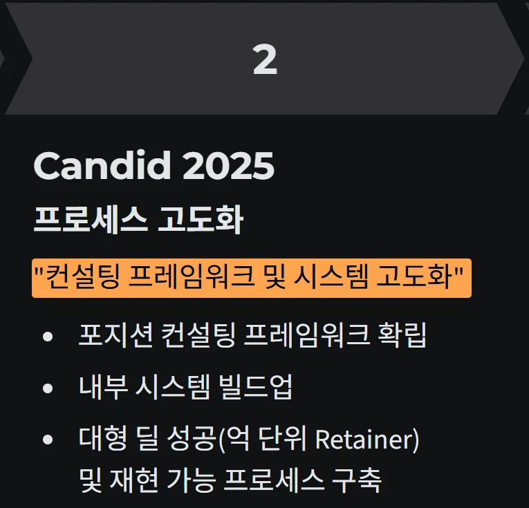 특히 컨설팅 프레임워크를 고도화하는 데 많은 시간을 썼고, 오퍼레이션을 효율화할 수 있는 자체 ERP를 새롭게 만들었습니다. 기존 시스템을 사용하는 것이 아니라, 캔디드가 실제로 일하는 방식에 맞게 직접 만들어 사용하기 시작했죠.