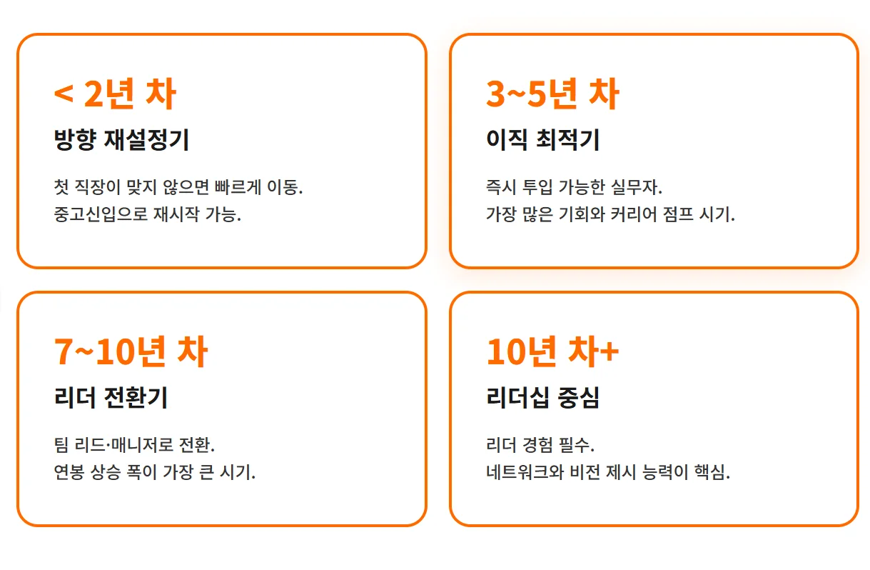 3~5년 차: 가장 이직하기 좋은 황금기. 실무 능력을 갖춰 교육 없이 바로 투입 가능한 경력이다. 대부분의 수평 이동이나 커리어 점프가 이때 일어난다.