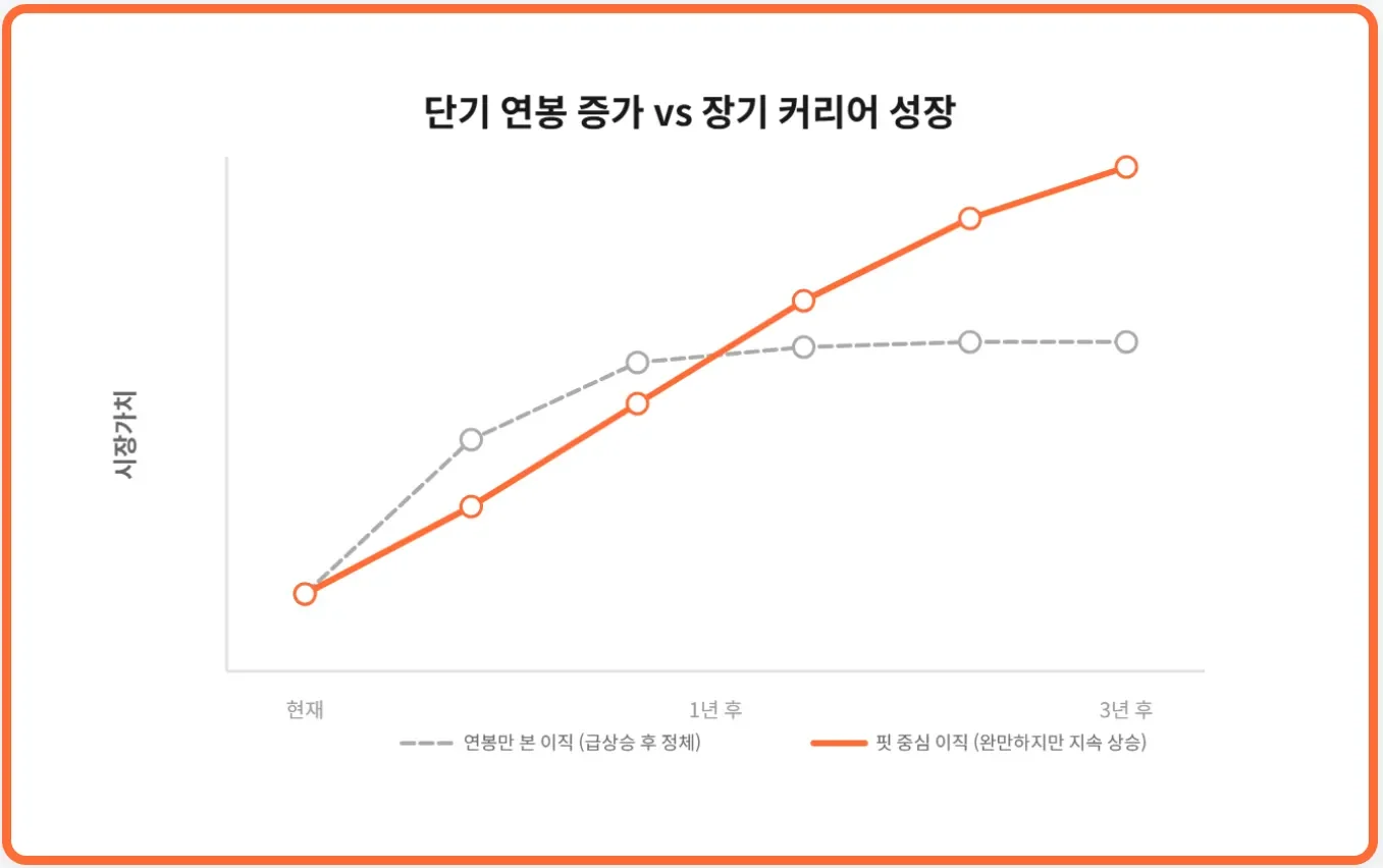 앞서 이야기했던 개발자처럼, 당장 연봉은 올랐지만 업무 핏이 맞지 않으면 1년 후 시장가치는 제자리입니다. 오히려 커리어에 공백이 생기거나, 잦은 이직으로 인해 평판에 부정적 영향을 줄 수도 있습니다.