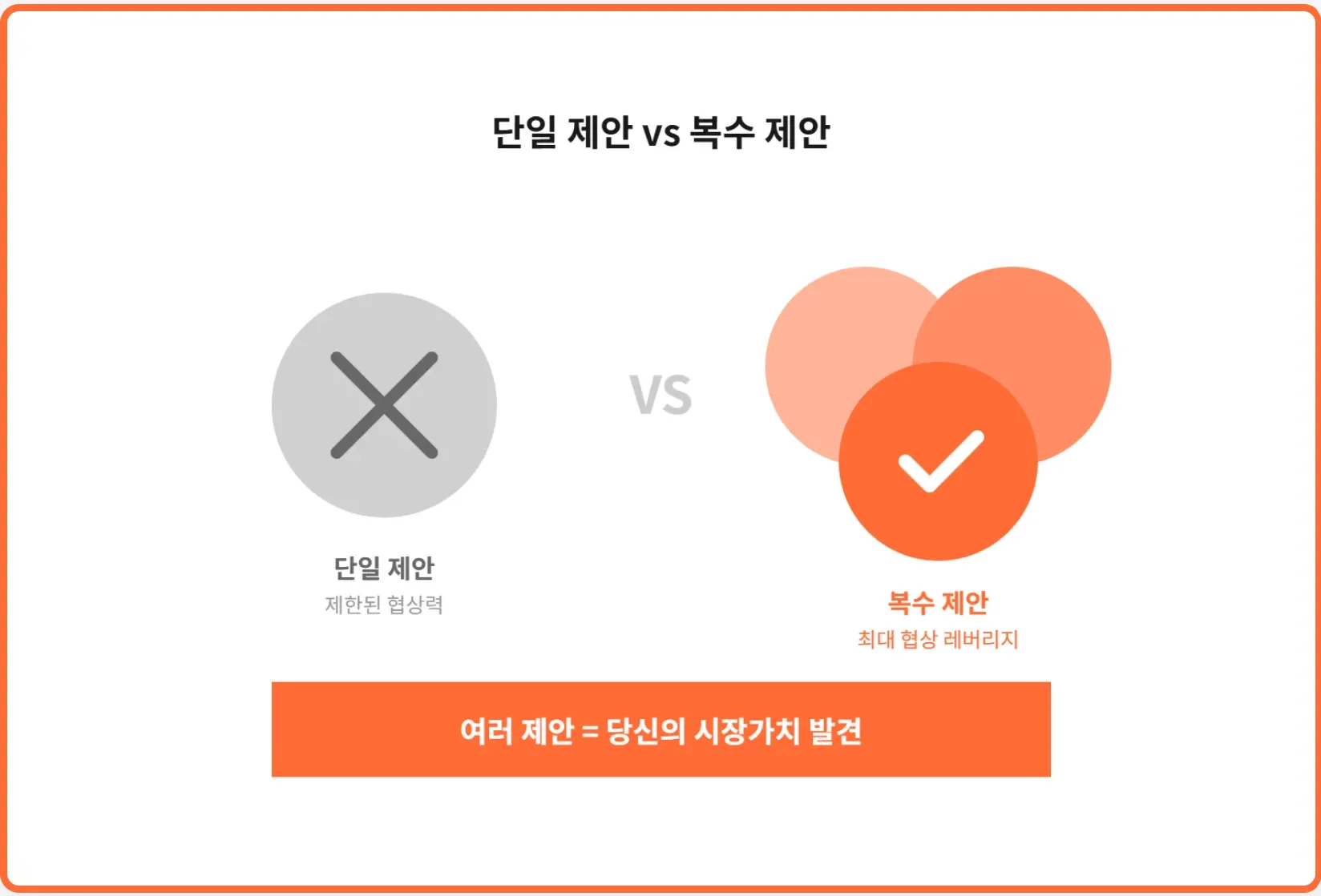 다른 선택지가 없으면 협상 테이블에서 불리할 수밖에 없습니다. 반면 여러 제안을 비교하는 상황이라면, "다른 곳에서도 좋은 제안을 받았다"는 사실 자체가 레버리지가 됩니다.
