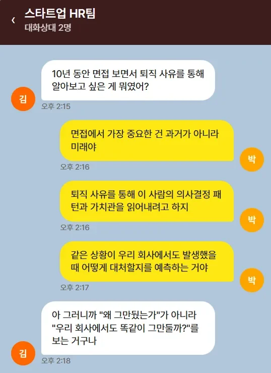 "면접에서 가장 중요한 건 과거가 아니라 미래입니다. 퇴직 사유를 통해 이 사람의 의사결정 패턴과 가치관을 읽어내려고 하죠. 같은 상황이 우리 회사에서도 발생했을 때 어떻게 대처할지를 예측하는 거예요."